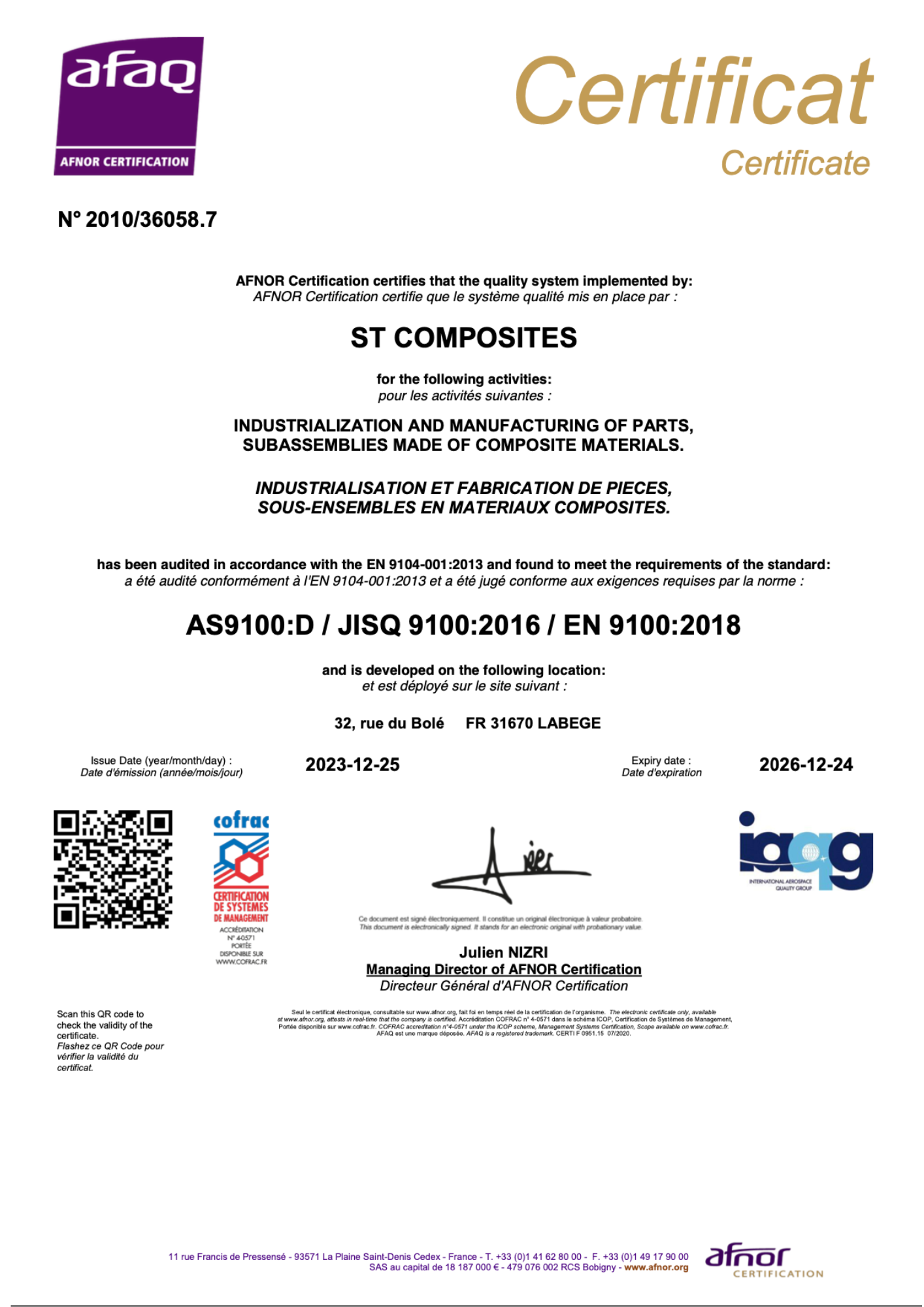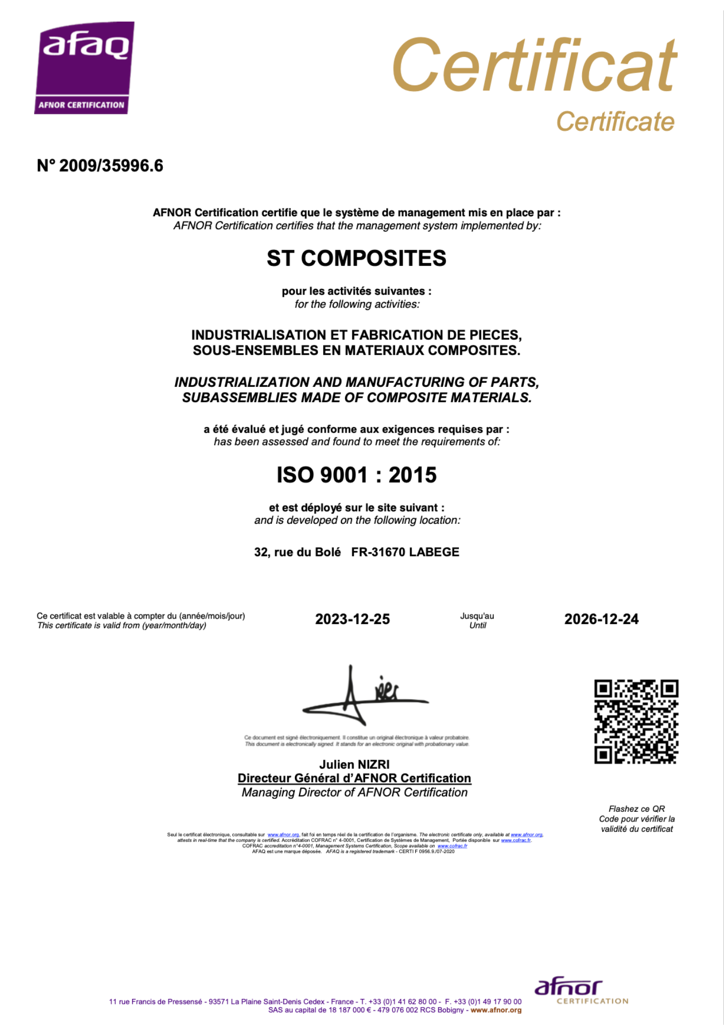 ST COMPOSITES certifiée ISO 9001 et EN9100 est inscrite dans une volonté d’optimisation de sa démarche de management de la qualité structurée suivant la norme nouvelle version de ISO 9001:2015 et AS9100:D / JISQ 9100:2016 / EN 9100: 2018.